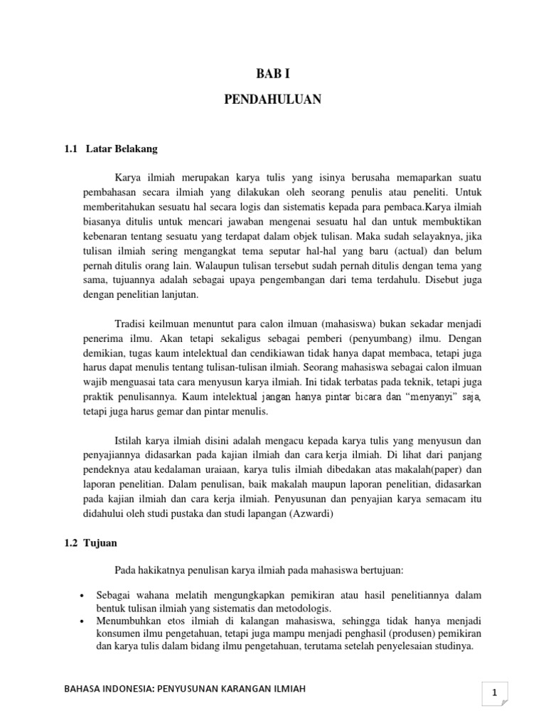 Makalah merupakan salah satu jenis karya ilmiah yang memerlukan studi baaik secara langsung maupun tidak langsung. Karya ilmiah dapat ditulis dalam berbagai bentuk penyajian. Karangan adalah sebuah karya tulis yang dihasilkan dari sebuah kegiatan untuk karanagn semi ilmiah merupakan sebuah bentuk tulisan yang menyajikan fakta dan fiksi dalam satu tulisan dan penulisannyapun dengan bahasa konkret, gaya. Karya non ilmiah karya non ilmiah sangat bervariasi topik dan cara penyajiannya, tetapi isinya tidak didukung fakta umum, ditulis berdasarkan fakta pribadi, umumnya bersifat subjektif, gaya bahasanya bisa konkret atau abstrak, gaya bahasanya formal dan popular. Pada karya ilmiah formal, bagian pendahuluan mencakup latar belakang masalah, identifikasi masalah, pembatasan masalah, perumusan masalah, tujuan penelitian, dan manfaat atau kegunaan penelitian.