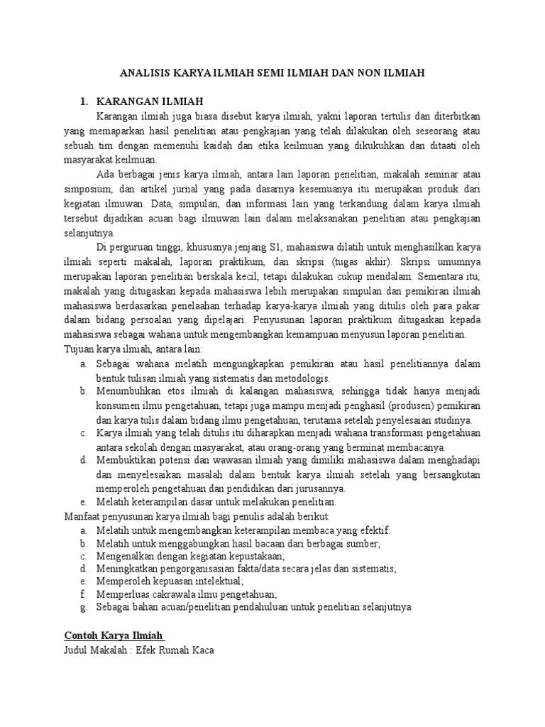 Biasanya karya tulis semi ilmiah digunakan dalam komik, anekdot, dongeng, hikayat, novel, roman dan cerpen. Ada beberapa macam contoh karya ilmiah, yakni seperti : 1 penyajian lisan karya ilmiah tujuan instruksional khusus setelah mengikuti kuliah ini, mahasiswa akan dapat menyajikan karya ilmiah secara lisan dengan efektif dan efisien. Karya ilmiah karya ilmiah atau tulisan ilmiah adalah karya seorang ilmuan yang ingin mengembangkan ilmu the power of dreams. 3 bentuk penyajian karya ilmiah. Kumpulan contoh karya ilmiah semi formal. Gaya bahasa formal dan popular; Kaleng dapat menjaga makanan dari kontaminasi bakteri penyebab penyakit. 7 contoh cover makalah beserta. Secara umum, bentuk penyajian karya ilmiah terbagi ke dalam tiga jenis, yaitu bentuk populer, bentuk semiformal, dan bentuk formal. Seperti yang kita ketahui untuk membuat sebuah tulisan, kita harus mengetahui apa yang akan kita tulis, tema apa yang diangkat dan termasuk ke kategori mana tulisan tersebut. Perbedaan karya ilmiah dengan semi ilmiah. Karya ilmiah tentang remaja, formal pengertian sebuah karya ilmiah ialah sebuah laporan tertulis yang berisikan tentang suatu hasil dari kesimpulan ini yang disampaikan dari penulis umumnya juga berupa sebuah penjelasan yang.